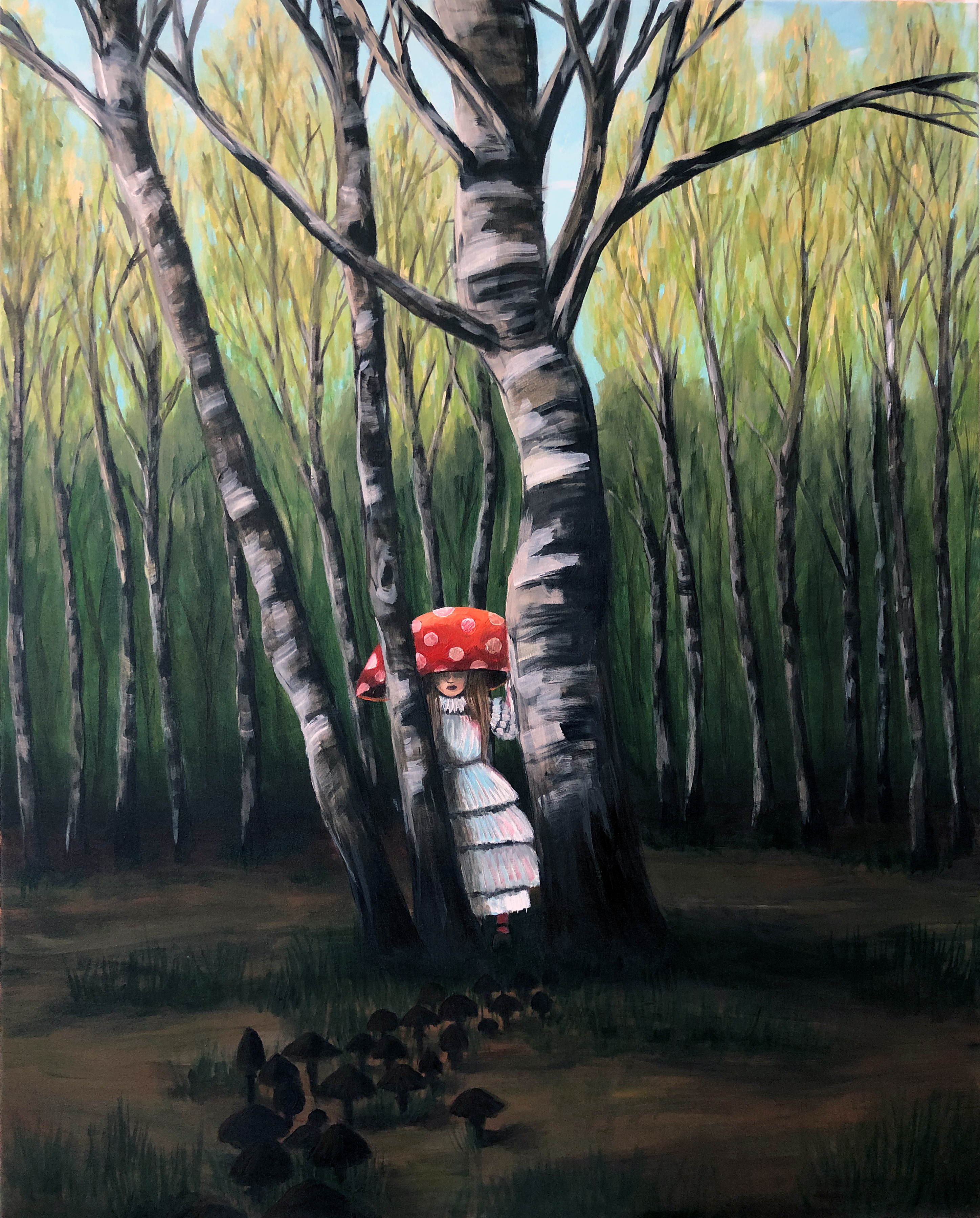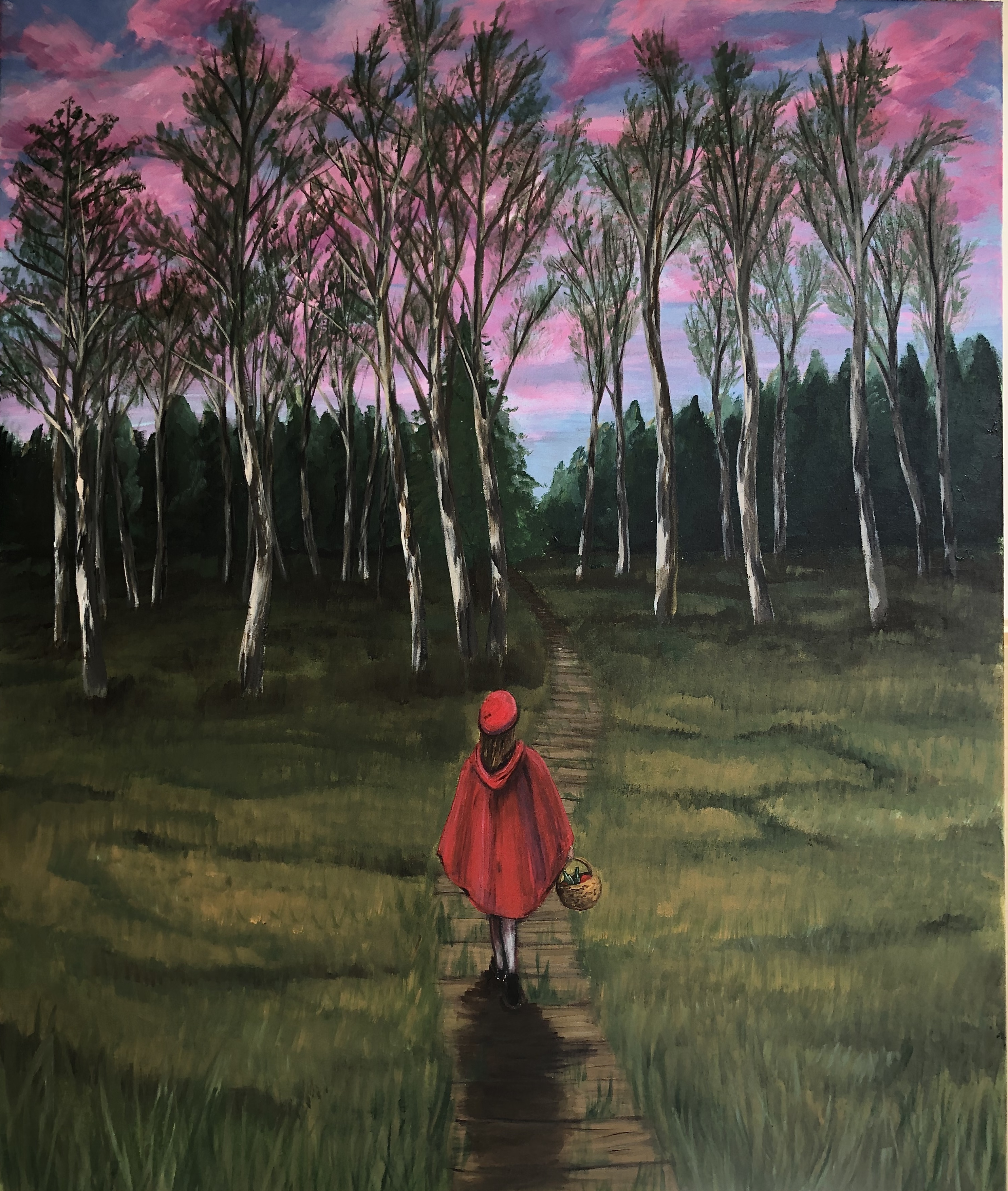 rough the forest ( red riding hood on way to her grandma) acrylic media on canvas 75×90 cm
