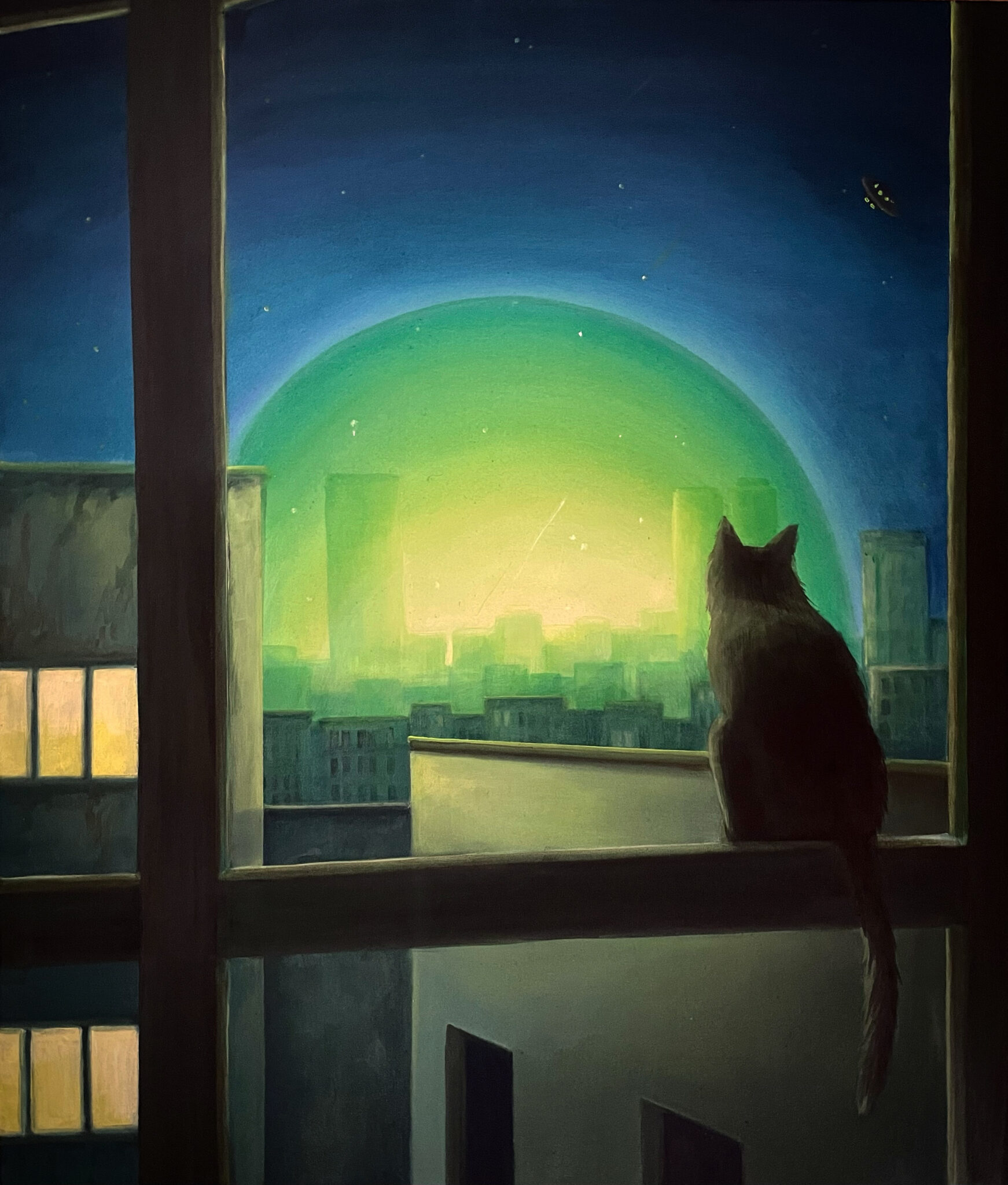 Cat lady dreaming, acrylic media on canvas 100×130 cm